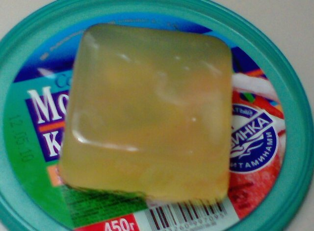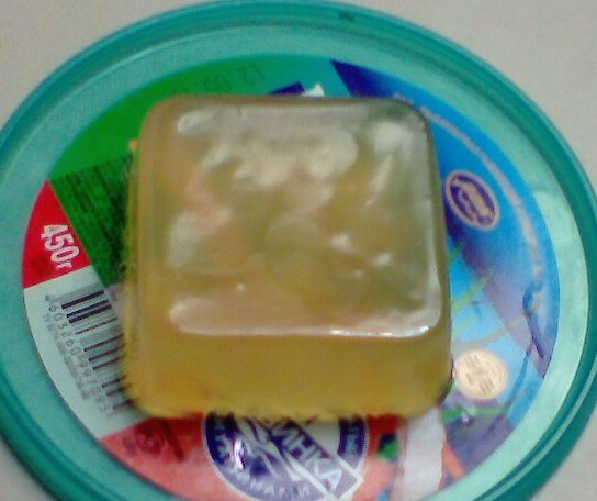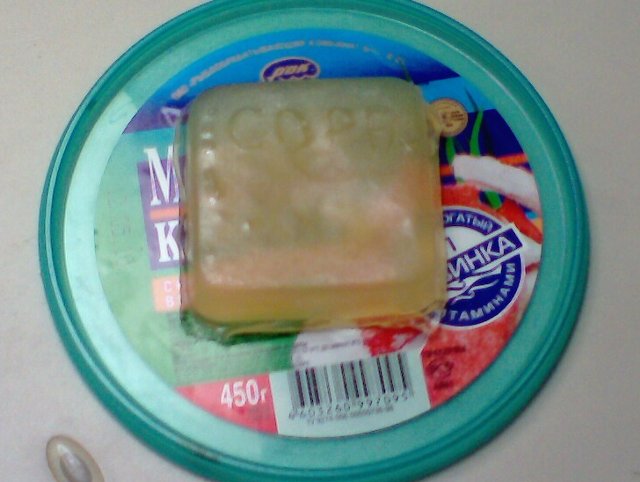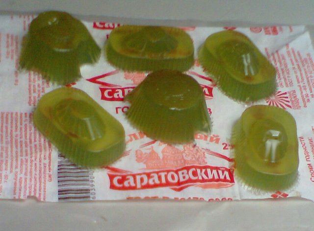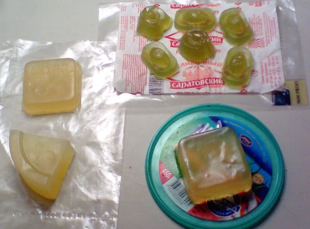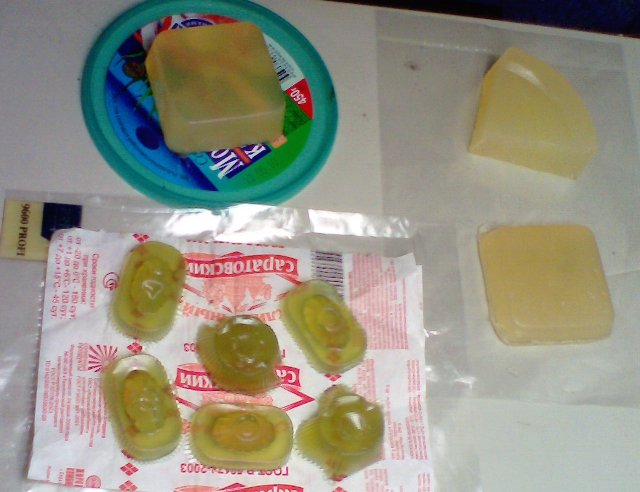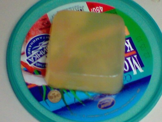 Вот. Сварил мыло "с нуля". Подкрасил-ароматизировал хлорофиллиптом. Залил в упаковку от конфет. Цвет - нежно-зелёный, как у мармелада.